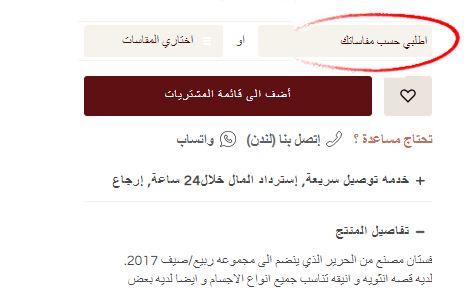 اضغطي على زر التسوق حسب المقاسات واتبع الخطوات. ان لم يتواجد الزر هذا يعني ان الخيار غير متوفر للمنتج المختار